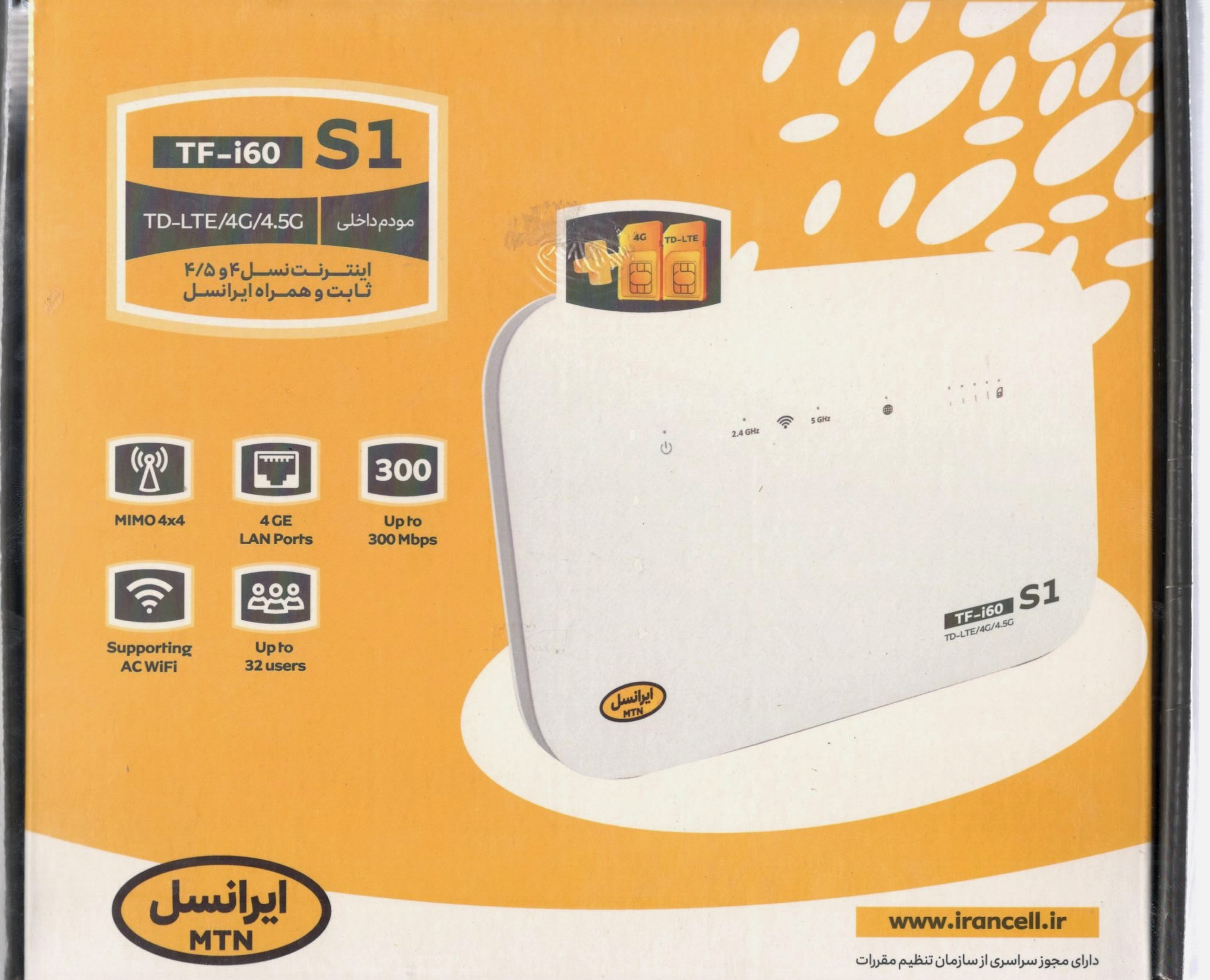 مودم «TF-i60 S1» محصولی از برند «ایرانسل» (Irancell) است. ایرانسل در جایگاه یک شرکت مخابراتی این مودم را در ایران عرضه کرده است. مودم TF-i60 S1 میتواند از شبکههای نسل 4 و 4.5 تلفن همراه پشتیبانی کند و میتوان از سیمکارتهای معمولی (FD) و TD-LTE در آن بهره گرفت. یک پورت WAN در این مودم وجود دارد که امکان دریافت اینترنت از دستگاههای دیگر و به اشتراکگذاری آن از طریق شبکهی بیسیم TF-i60 H1 را امکانپذیر میکند. پشتیبانی همزمان از 4 عدد SSID از قابلیتهای بسیار خوب این دستگاه است. کاربر مودم TF-i60 S1 میتواند بنابر نیاز خود تا 4 شبکهی بیسیم مستقل را ایجاد کند و هر شبکه را در اختیار گروه خاصی از کاربران قرار دهد. تا 32 کاربر میتوانند به صورت همزمان به وایفای ایجادشده توسط مودم TF-i60 S1 وصل شوند؛ به این معنی که میتوان برای مصارف اداری و تجاری در شرکتهای کوچک تا متوسط هم از TF-i60 S1 استفاده کرد.